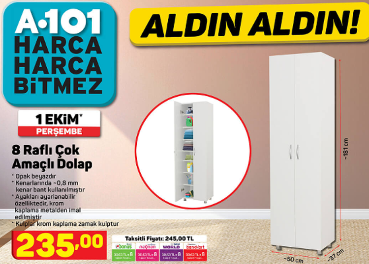 A101 aktüel kataloğunda da gösterildiği gibi bir çok çeşide ev sahipliği yapıyor. Bofigo 8 raflı 2 kapaklı çok amaçlı mutfak dolabı banyo dolabı çok amaçlı dolap. 8 raflı çok amaçlı dolap en uygun fiyat seçeneği, 150 tl ve üzeri alışverişlerde ücretsiz kargo fırsatı ve daha birçok ürünü a101'de! Hemen aşağıda ürün özellikleri ve market satış fiyatını. Çok amaçlı dolap arıyorsan site site dolaşma! 13 şubat a101 kampanyası incelememizde 4. 8 raflı çok amaçlı dolap alternatifleri, çok sayıda ayrı eşyasını düzenlemek ve türlerine göre ayrı ayrı yerleştirmek isteyenlere hitap ediyorlar. Güncel aktüel ürünlerini paylaşarak sizleri bilgilendirmekteyiz. Hedef ürünler 14.762 views5 months ago. Metal kulplara sahip, 181 cm yüksekliğinde 8 raflı çok amaçlı dolap 229 tl.